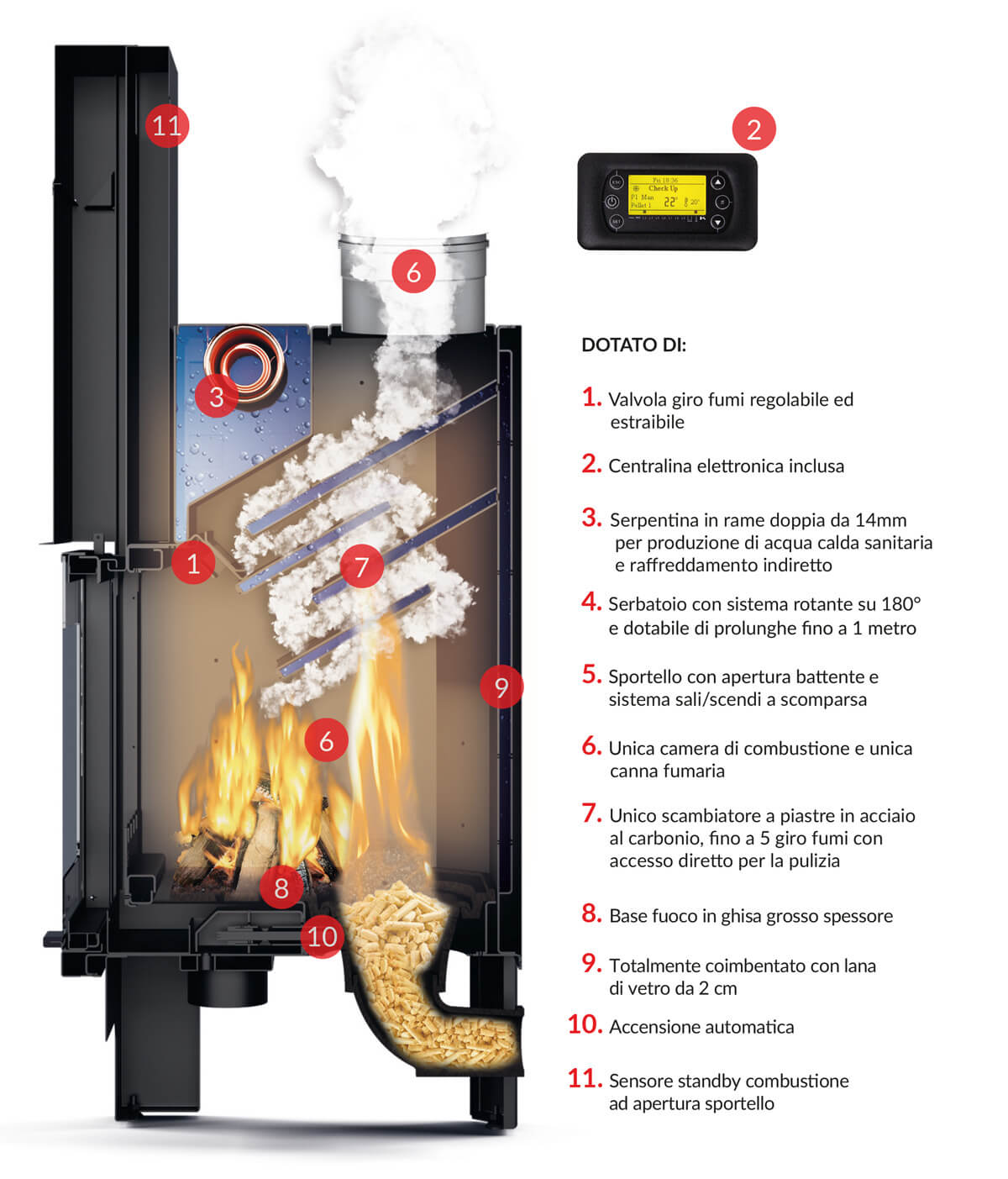Nuovo design essenziale e moderno per il famoso termocamino combinato FUEGO. Super compatto, versatile, silenzioso e facile da gestire e pulire. Funzionante a legna, pellet, nocciolino di oliva, e tutti gli altri combustibili pellettizzati e triturati.