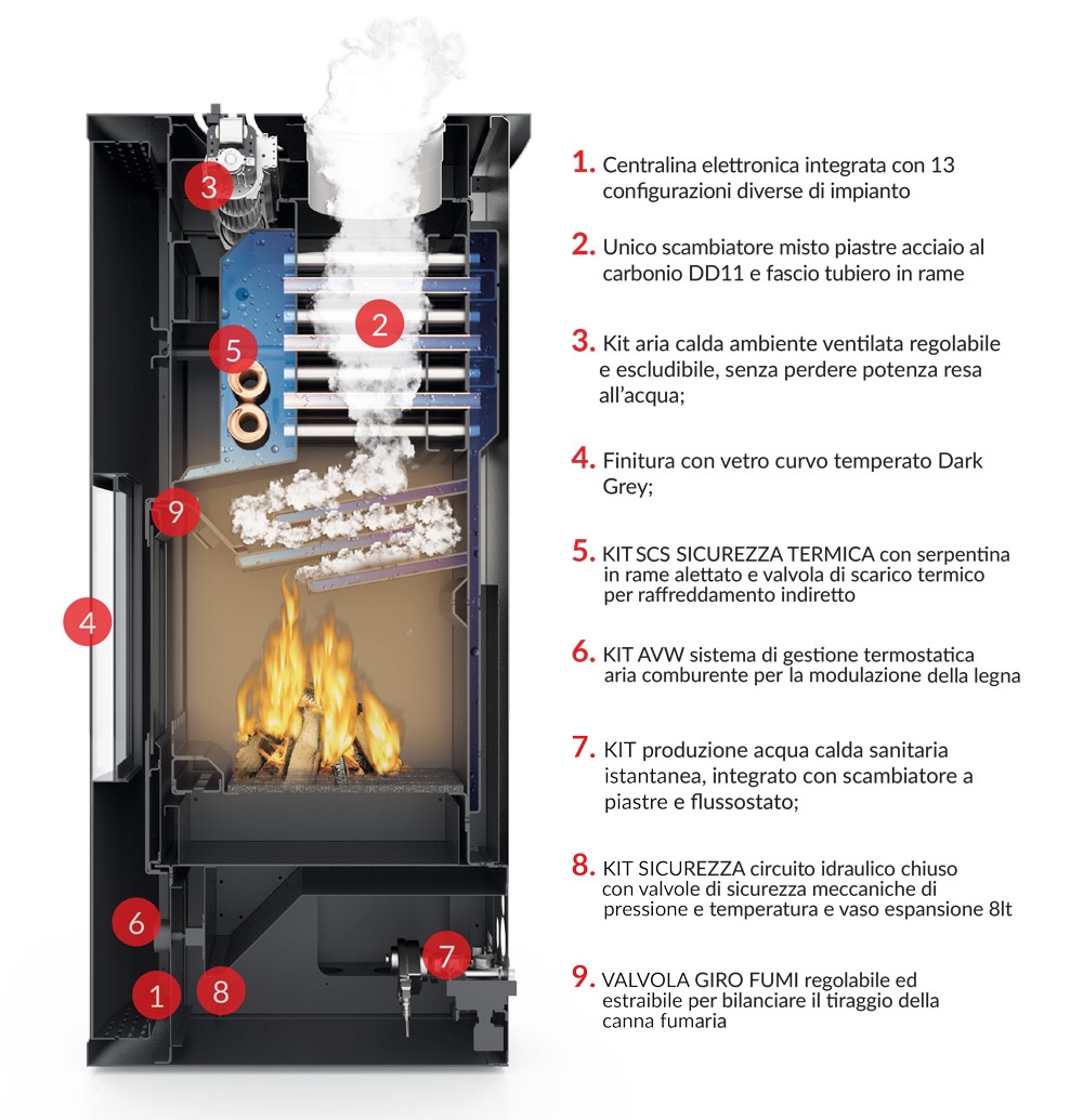 La termostufa è dotata di tutti gli accessori a bordo ed è in grado di produrre acqua tecnica e riscaldare ambienti importanti fino a 400 m³, producendo anche acqua calda sanitaria continua e costante grazie al suo kit integrato a piastre in rame, senza perdita di potenza. Inoltre, sfruttando la fuoriuscita dei fumi caldi nella canna fumaria, effettua un recupero di calore producendo aria calda nell’ambiente.