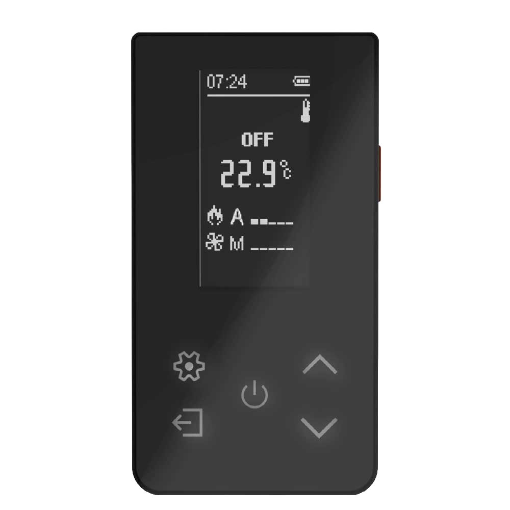 Il Monolite FUEGO è il nuovo radiocomando LCD per sistema SmartStove. Disegnato con linee minimali per una ergonomia unica, con portata di trasmissione e ricezione di 10m.